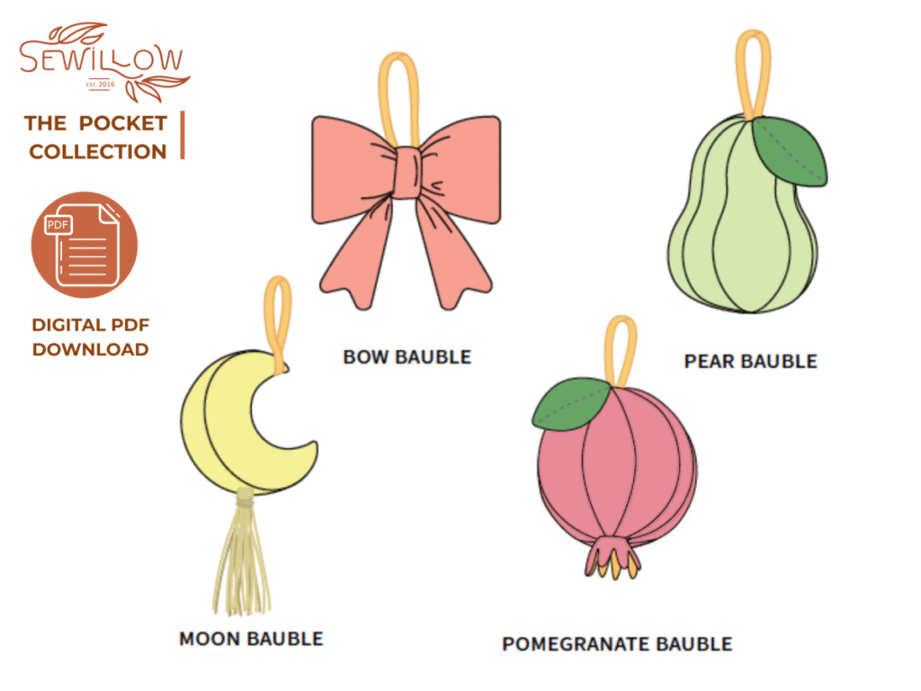 Each bauble tells its own story — a sculptural bow tied in plush velvet, an elegant pear cradled by soft leaves, a crescent moon adorned with a silken tassel, and a jewel-like pomegranate crowned with delicate points. Together, they create a cohesive collection that’s as thoughtful to make as it is to give.