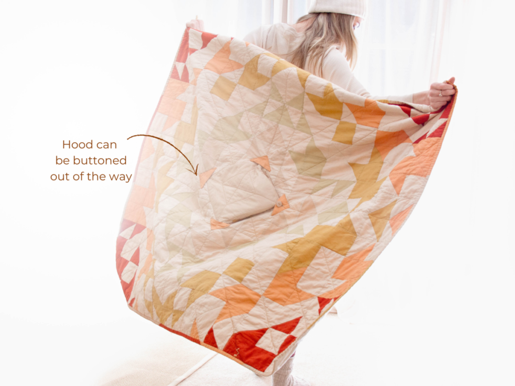 A convertible blanket quilt that can be worn as a hooded poncho.