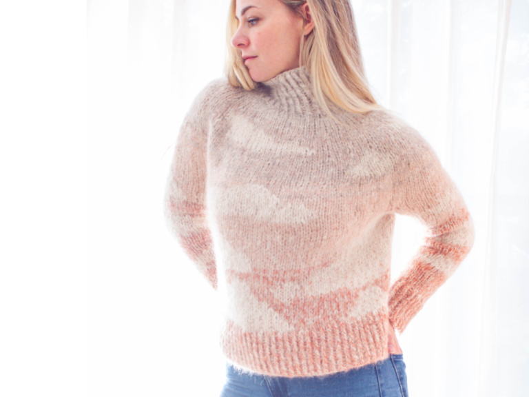 A sideways knitting pattern to make a cropped chunky wrap style seamless cardigan with wide sleeves. Knitted in two pieces on circular needles and grafted together at the centre of the back. A quick weekend project, and mostly easy, although the side seam method is unusual, so we have illustrated those steps to make it easier to follow.