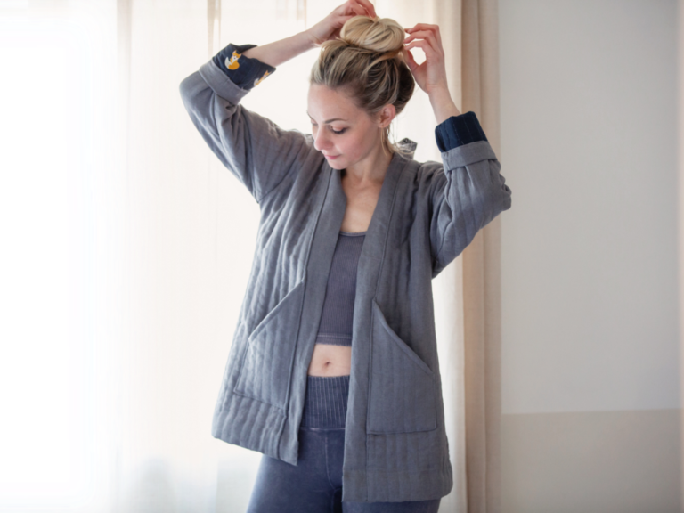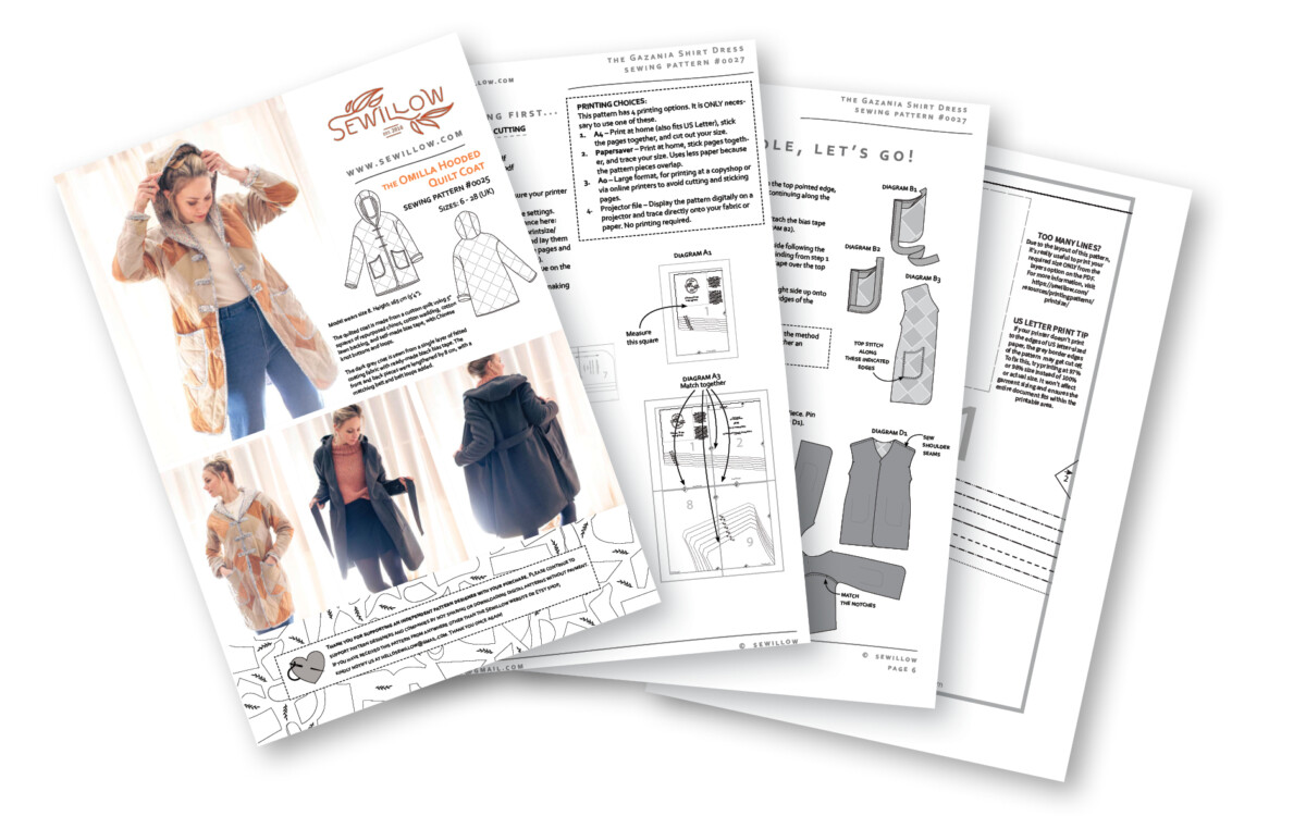 A sewing pattern for making a drop shoulder hooded coat, designed to utilize quilts or blankets. Instead of traditional hemming, edges are finished with a bias binding method, and the coat is constructed without a separate lining. The extra-long sleeves can be rolled or shortened, and the adaptable length allows for personalised length. Featuring deep curved pockets and various closure options, this pattern is an ideal project for quilters and sewists seeking a straightforward construction without the complexities of lining a coat.